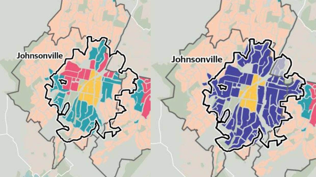 Proposed building height allowances for Johnsonville before and after new Government rules were introduced in July. The purple areas on the right indicate areas where six-storey or higher building height allowances are now proposed.
